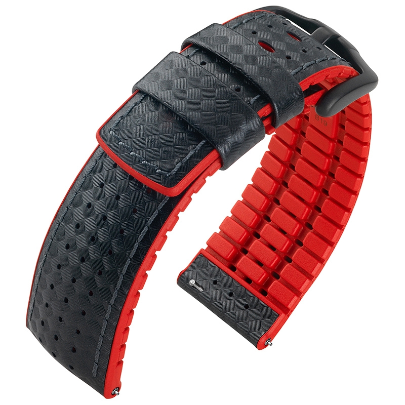 De Hirsch Ayrton is een sterke hightech horlogeband van soepel Hirsch Premium Caoutchouc rubber met een bovenlaag van Tecno kalfsleer in carbonstructuur. De toon-op-toon-kleuren, de functionele ovale perforatie, de matzwarte gesp uit roestvrij staal en een brede, losse lus geven Ayrton zijn mannelijk-sportieve karakter.