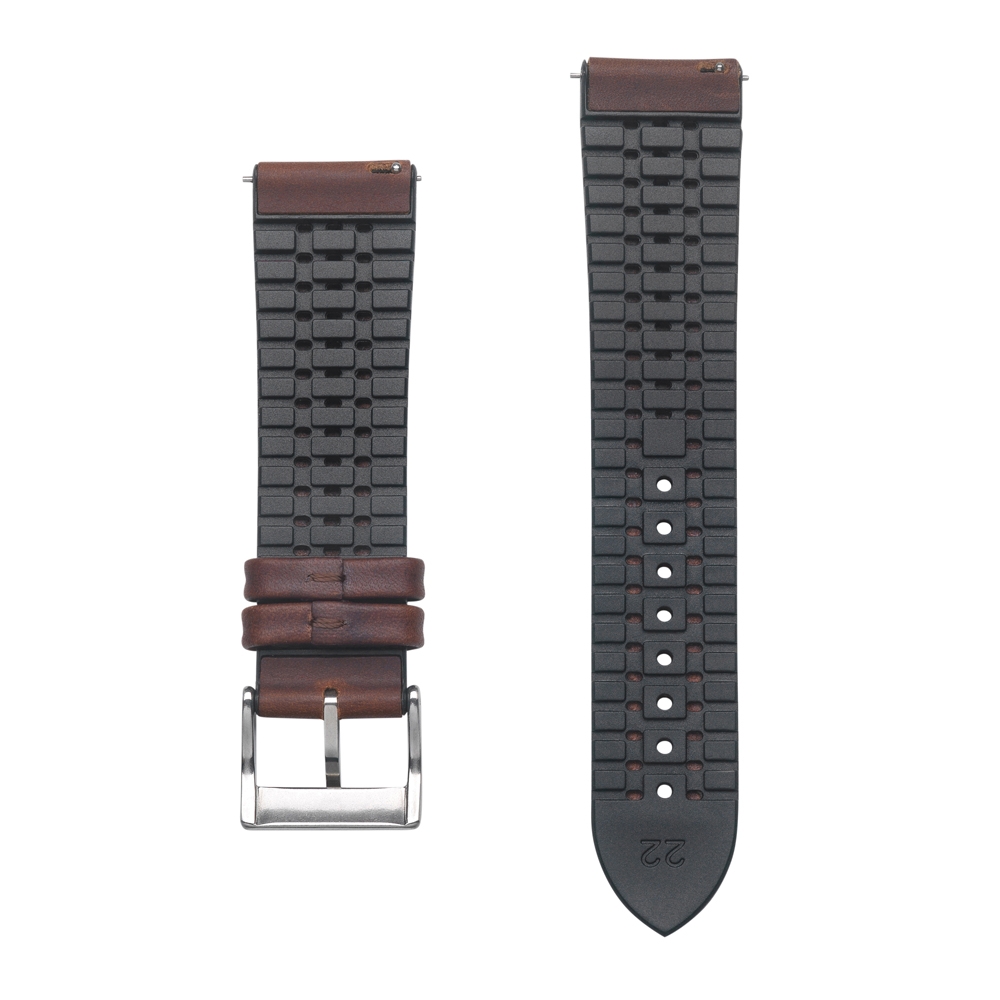 Deze horlogeband heeft een toplaag van mat "vintage" leer op een soepel rubberen basis. De rubberen horlogeband heeft een open structuur, waardoor tussen de huid en de horlogeband constant zuurstof kan komen en daardoor veel prettiger draagt dan solide rubberen horlogebanden.