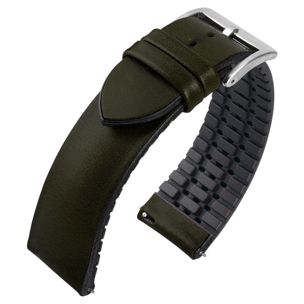 Deze horlogeband heeft een toplaag van leer op een soepel rubberen basis. De rubberen horlogeband heeft een open structuur, waardoor tussen de huid en de horlogeband constant zuurstof kan komen en daardoor veel prettiger draagt dan solide rubberen horlogebanden.