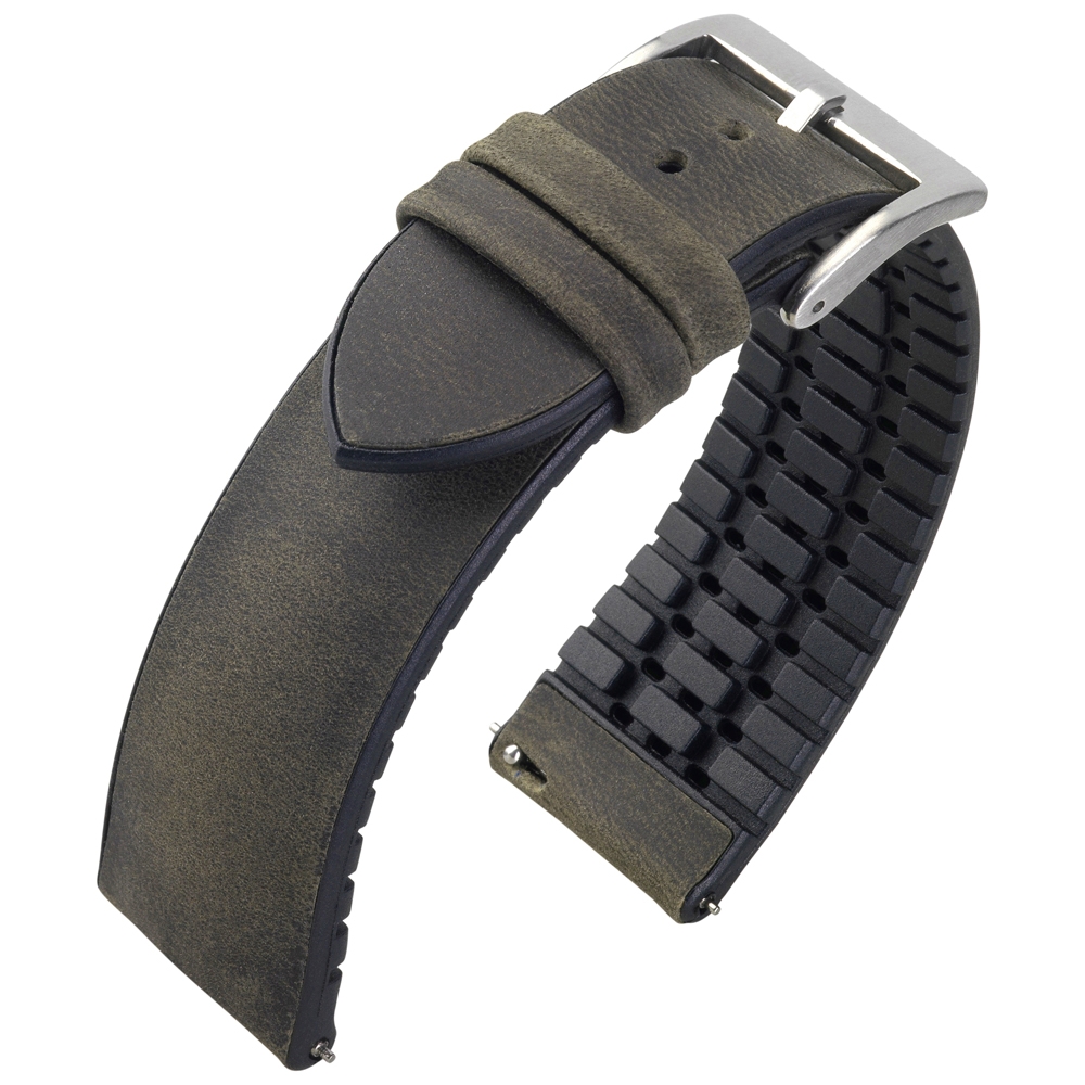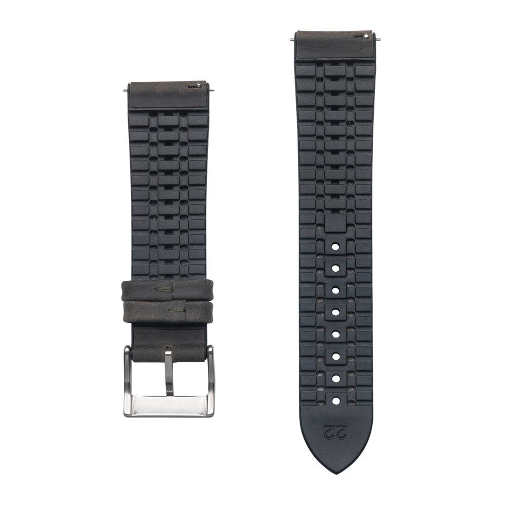 Deze horlogeband heeft een toplaag van mat "vintage" leer op een soepel rubberen basis. De rubberen horlogeband heeft een open structuur, waardoor tussen de huid en de horlogeband constant zuurstof kan komen en daardoor veel prettiger draagt dan solide rubberen horlogebanden.