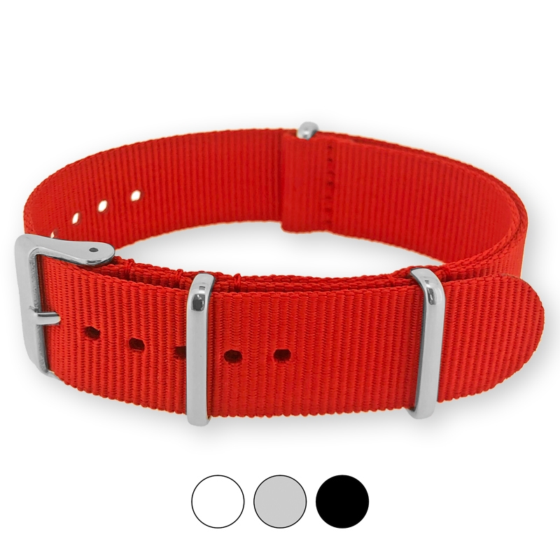 De rode NATO band is gemaakt van extra sterk geweven nylon. Alle randen en gaten zijn door middel van laser gesealed, waardoor de horlogeband geen ruwe of rafelige randen heeft.