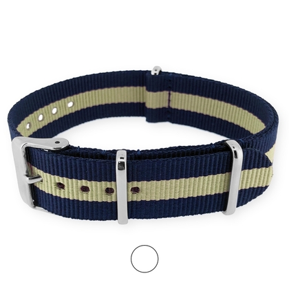 Deze blauw en beige NATO band is gemaakt van extra sterk geweven nylon. Alle randen en gaten zijn door middel van laser gesealed, waardoor de horlogeband geen ruwe of rafelige randen heeft.