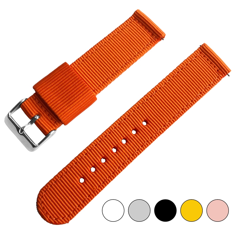 De oranje "Two Piece" RAF NATO strap, is een horlogeband in de NATO stijl, die echter net als een normale horlogeband bestaat uit twee delen, met een verschuifbare passant. De van extra sterk geweven nylon gemaakte horlogeband heeft ingebouwde "quick release" bandpennen, waardoor de band eenvoudig en zonder gereedschap kan worden geplaatst.
